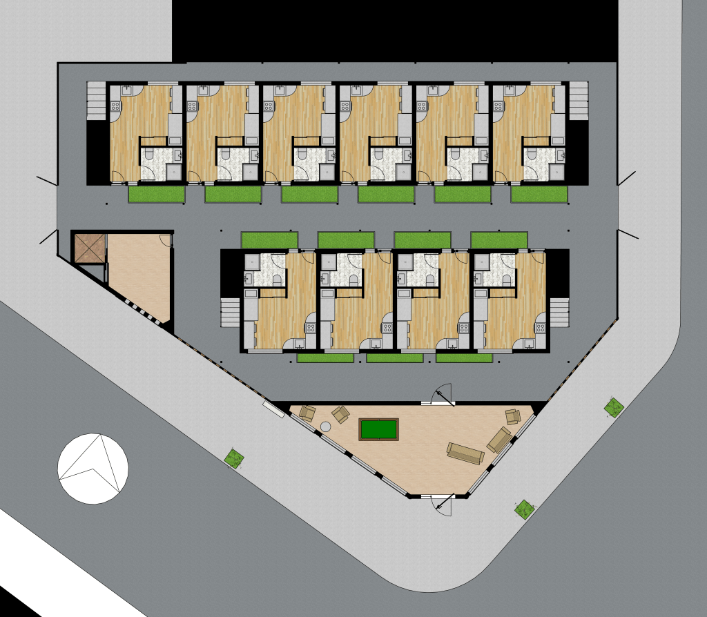 In this building there are 11 small units and 7 family units. The amount and size of these units is based on trying to fit as many people in this facility as possible, while they feel comfortable and not cramped inside. Large windows also help make the space seem bigger.