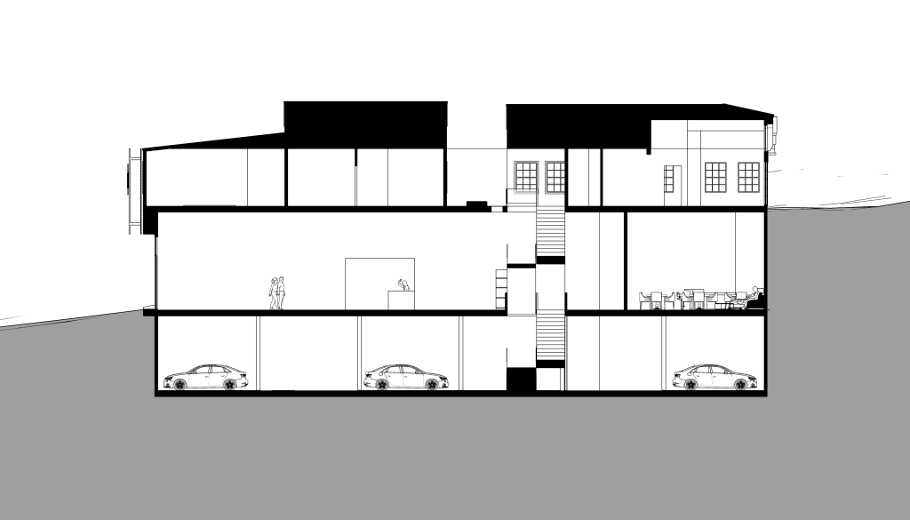 This land was unique in that it’s on a hill that spans from a semi-busy intersection to a neighborhood street. The idea here was to somehow combine a commercial building with a residential one, and that’s what I did.