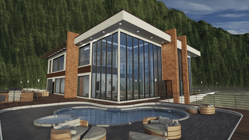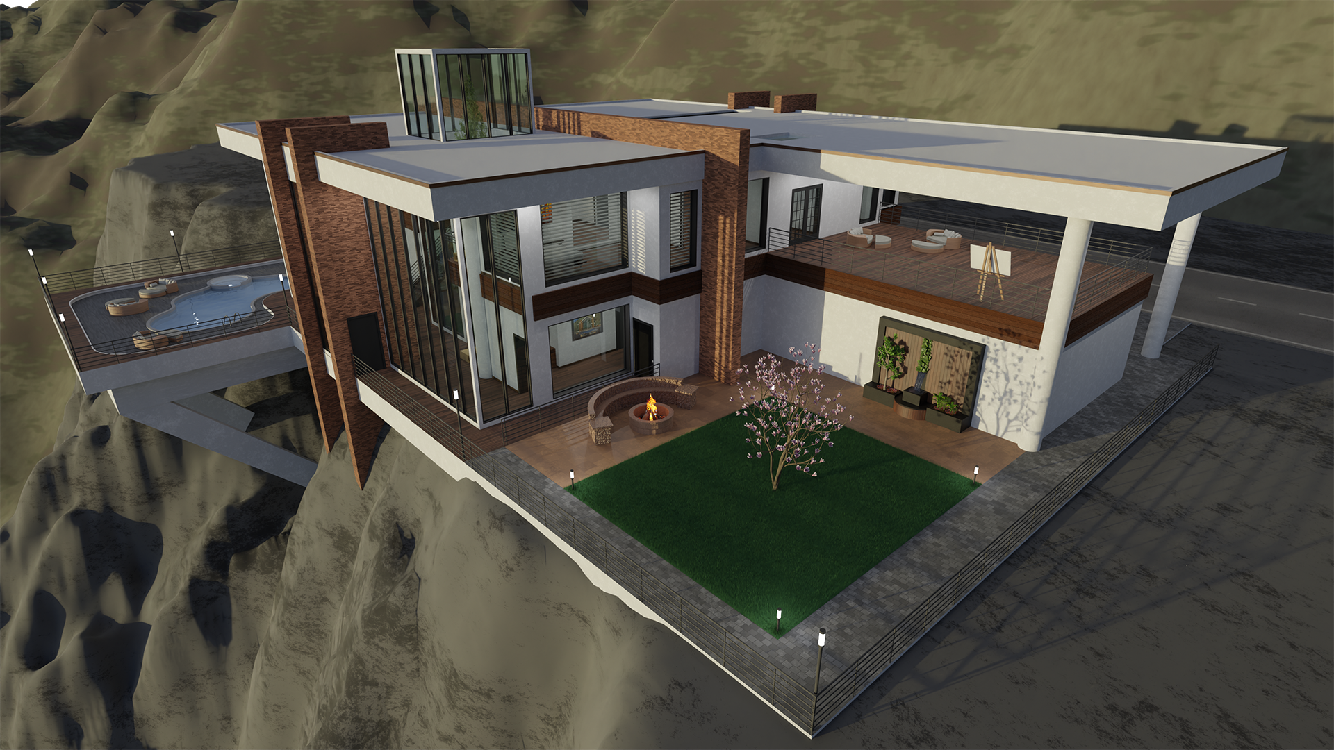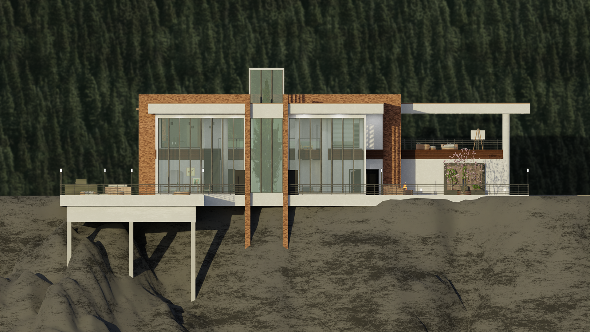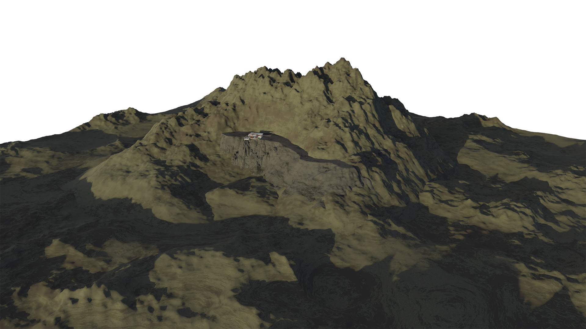 To immerse the building into its surroundings, one of two ways is usually used; to either Photoshop it into a photograph of an actual site, or to build the terrain digitally. With my current low processing power, I didn’t have the ability to add trees and vegetation, but I wanted to demonstrate that this is in fact possible. I used mathematical models to automatically generate multiple terrains and then I combined them.