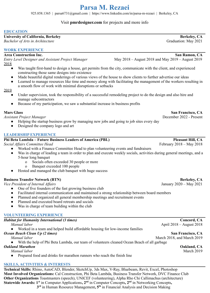 I’m a valuable graduate from the University of California Berkeley with an architecture degree who was involved with construction clubs and companies like Cal Construction (club), Area Construction, and Dome Construction and I want to provide my skills, knowledge, and potential to you.